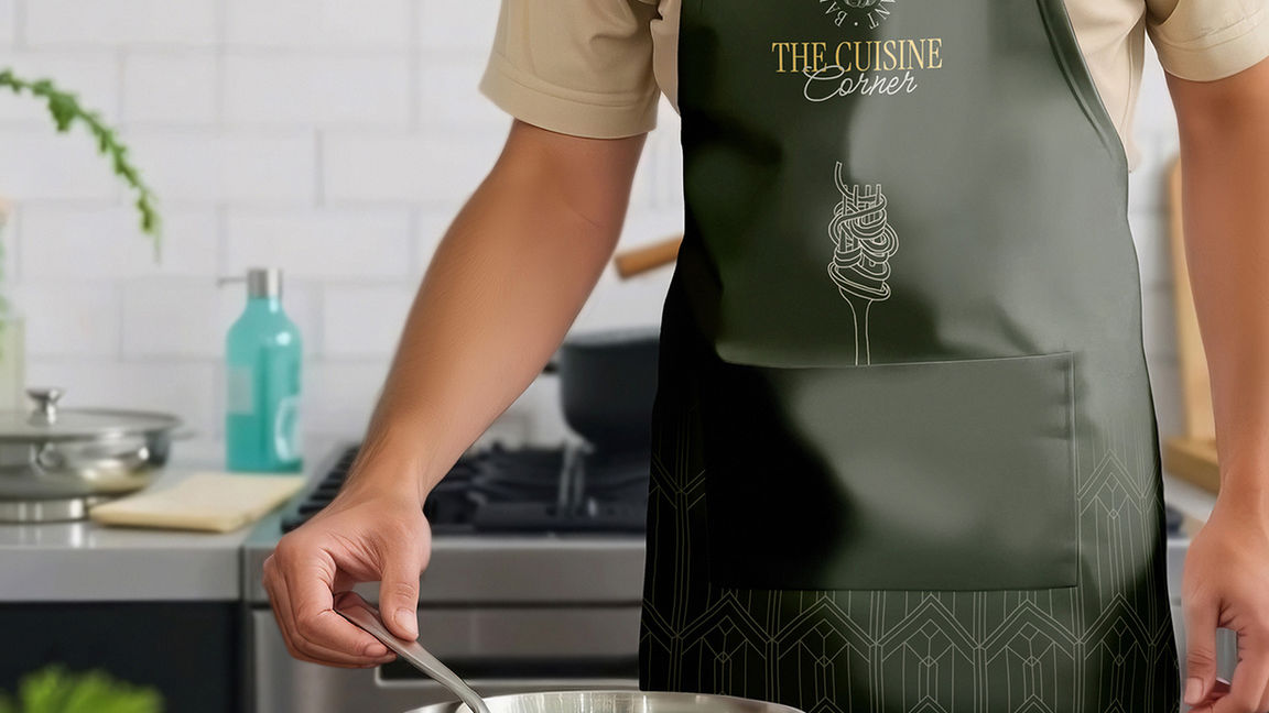 This mockup depicts a man wearing an apron in a stylish kitchen. It's perfect for presenting your design in a real-world context. Clean and professional, it's ideal for branding, promotions, or product demonstrations.