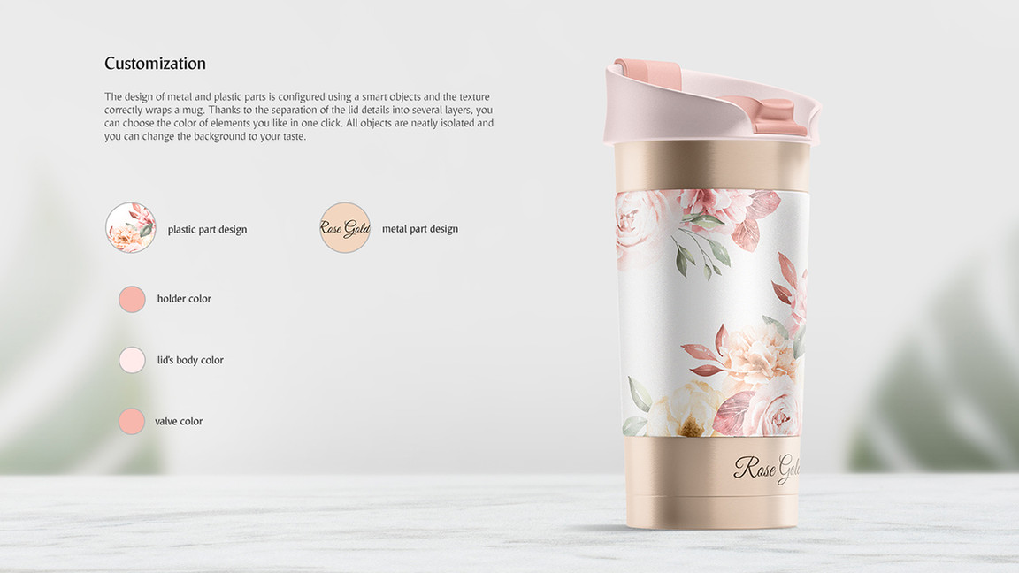 On this thermo mug any of your designs will look attractive thanks to pre-configured effects of glare and shadows.