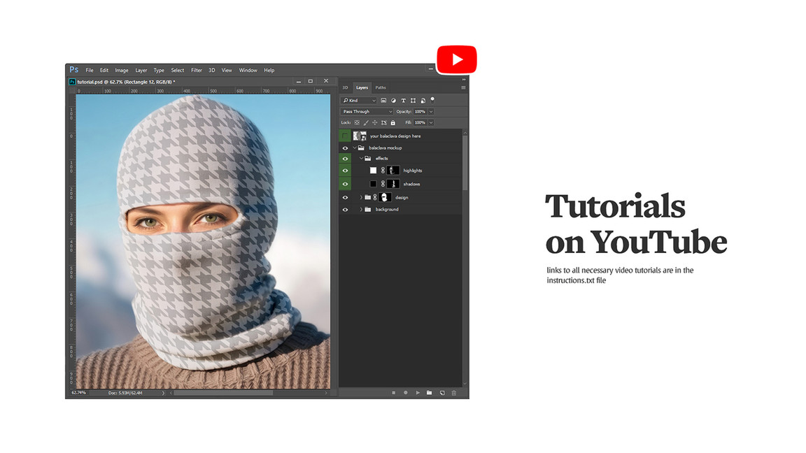 This balaclava mockup features a clean, minimal design with a smooth fabric surface that highlights any artwork placed on it. The editable smart object allows you to easily insert your design and see it naturally wrap around the contours of the mask.