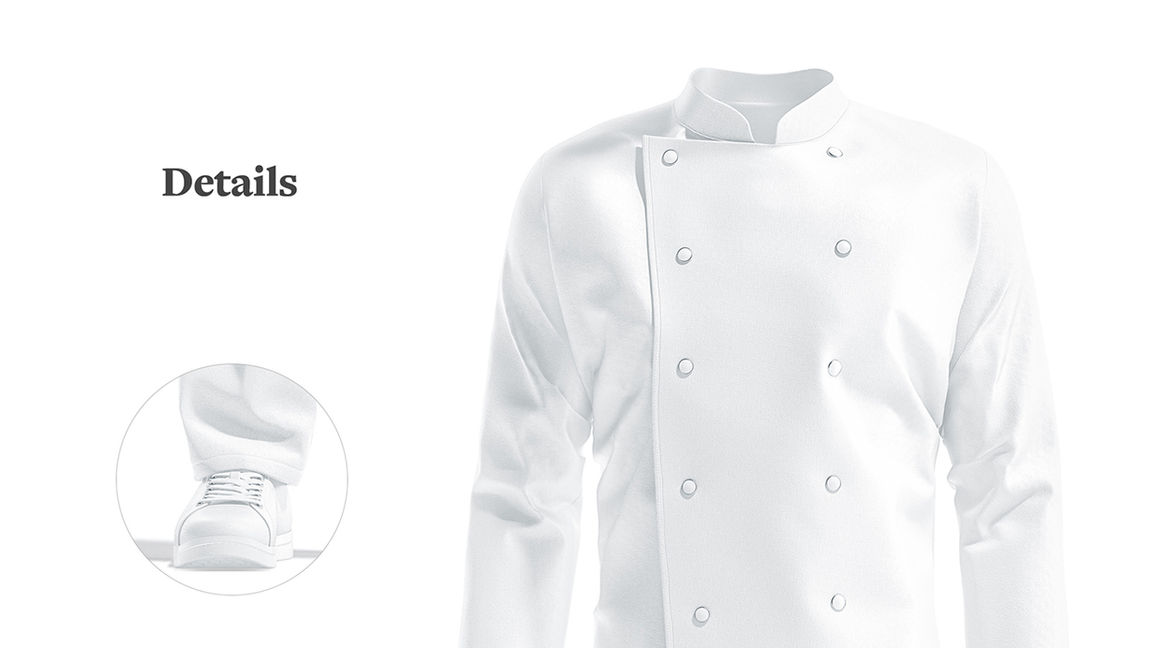 Create a complete style for the Chef Uniform by applying the design separately on the jacket, pants and hat. Adjust highlights and shadows effects to achieve a more realistic scene.