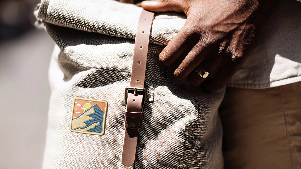 Ready-made realistic close up scene with embroidered patch on light canvas bag. Choose from 3 patch shapes: round, square or rhombus, customize the edge color and lighting effects.