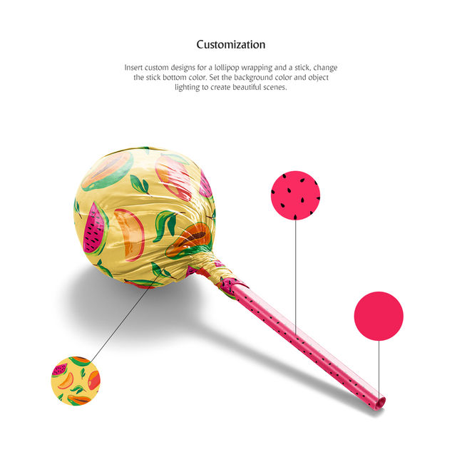 It's time for your sweet ideas! Insert custom designs for a lollipop wrapping and a stick, also change the lollipop color. Set the background color and object lighting to create beautiful scenes.
