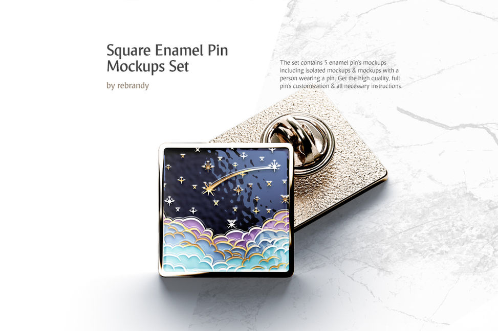 psd with isolated enamel pin front and back side (top view, side view and stack);